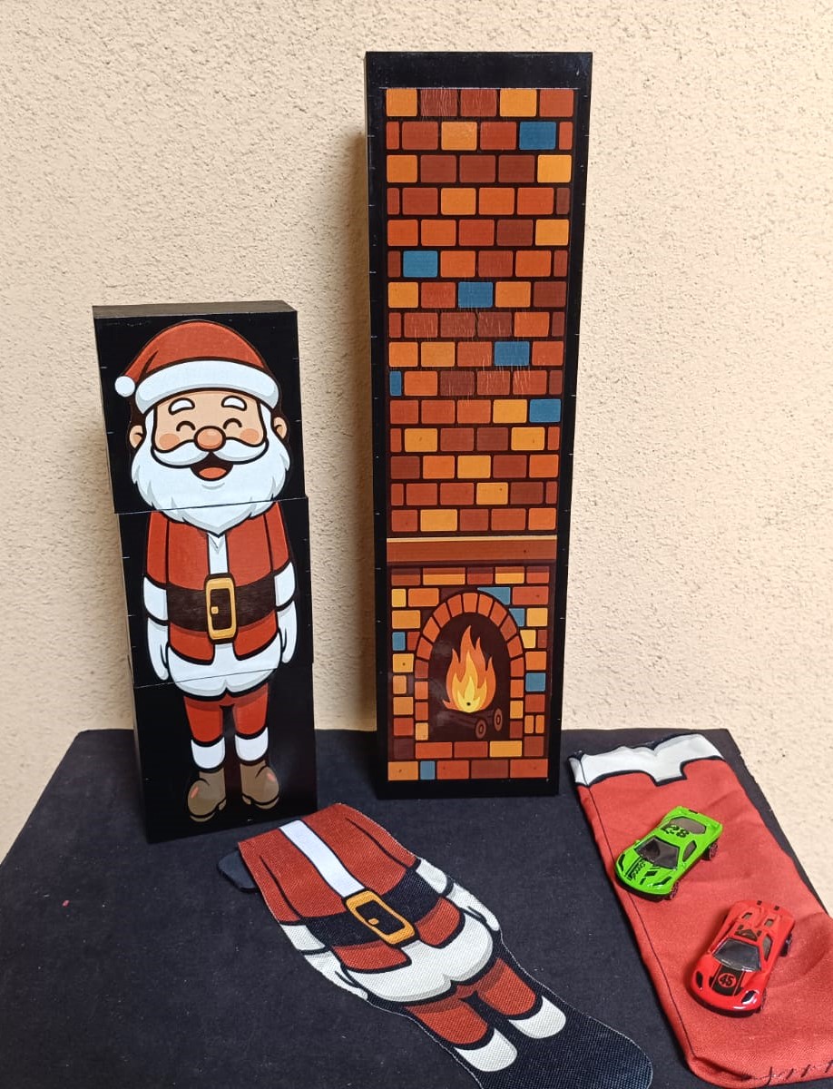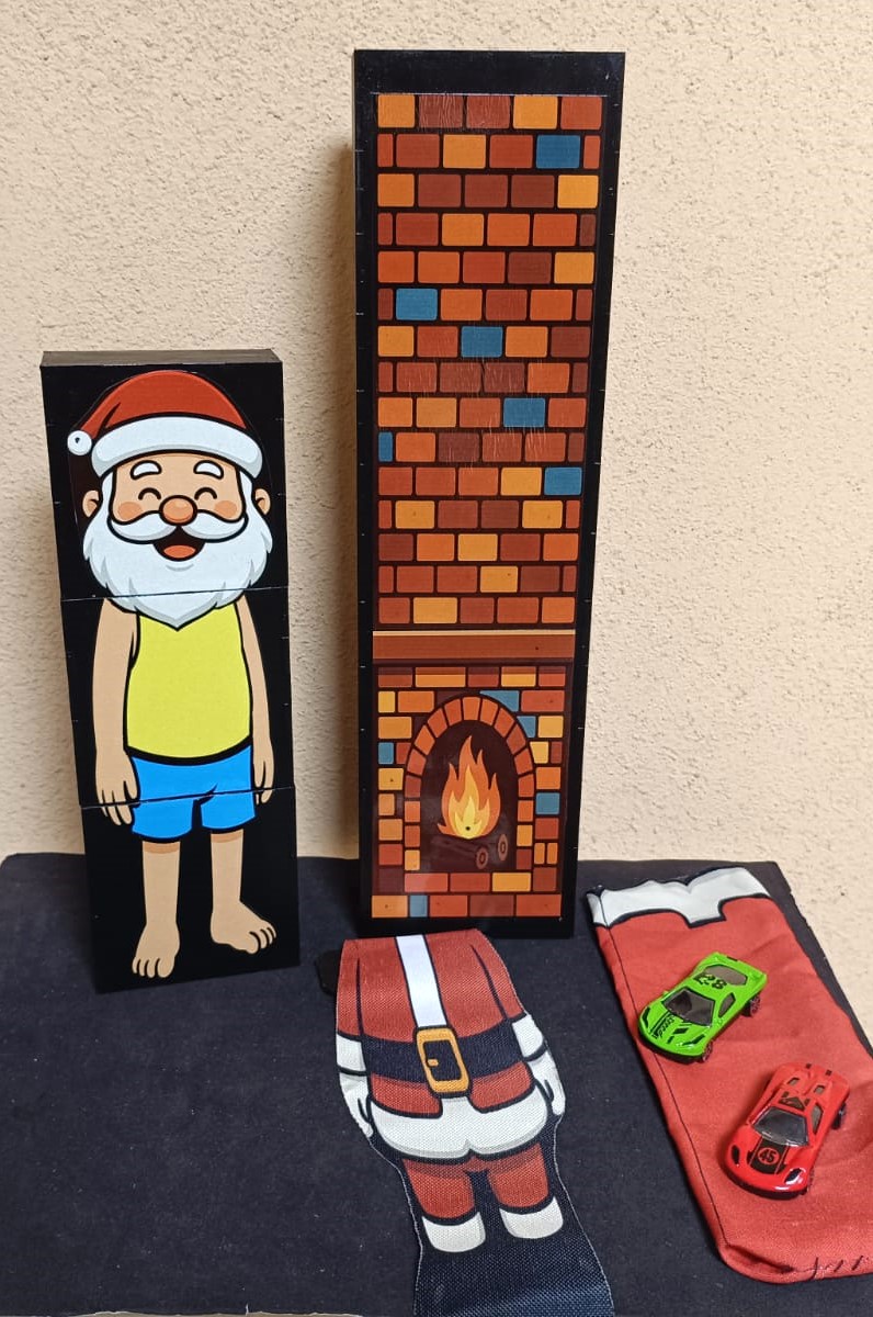 El mago relata como Papá Noel ingresa por las chimeneas a las viviendas y muestra tres bloques que conforman la imagen completa de Papá Noel. También muestra un tubo decorado con una chimenea para colocar los bloques.