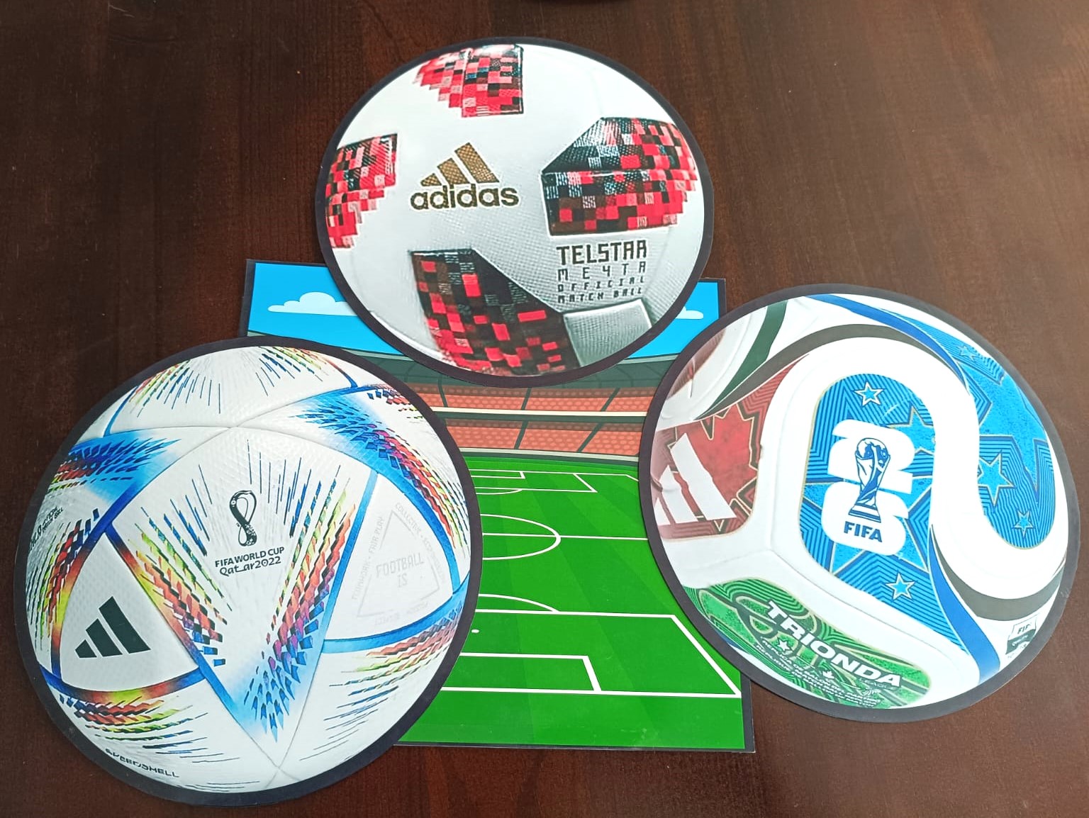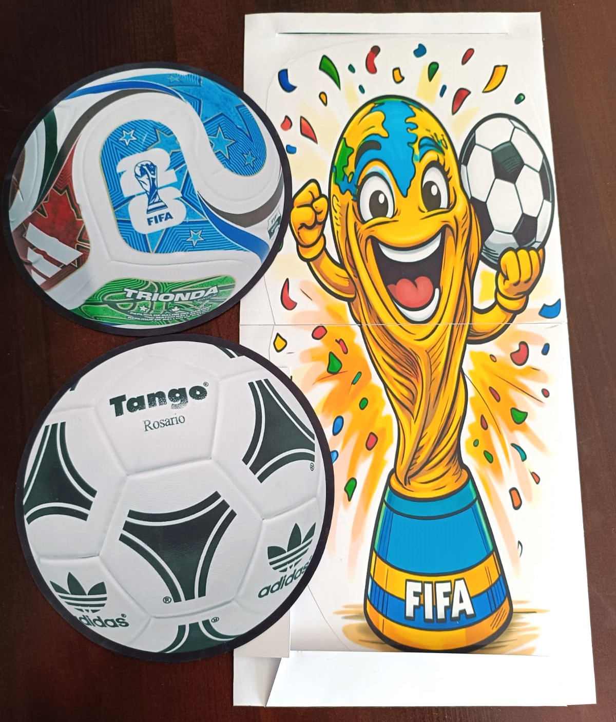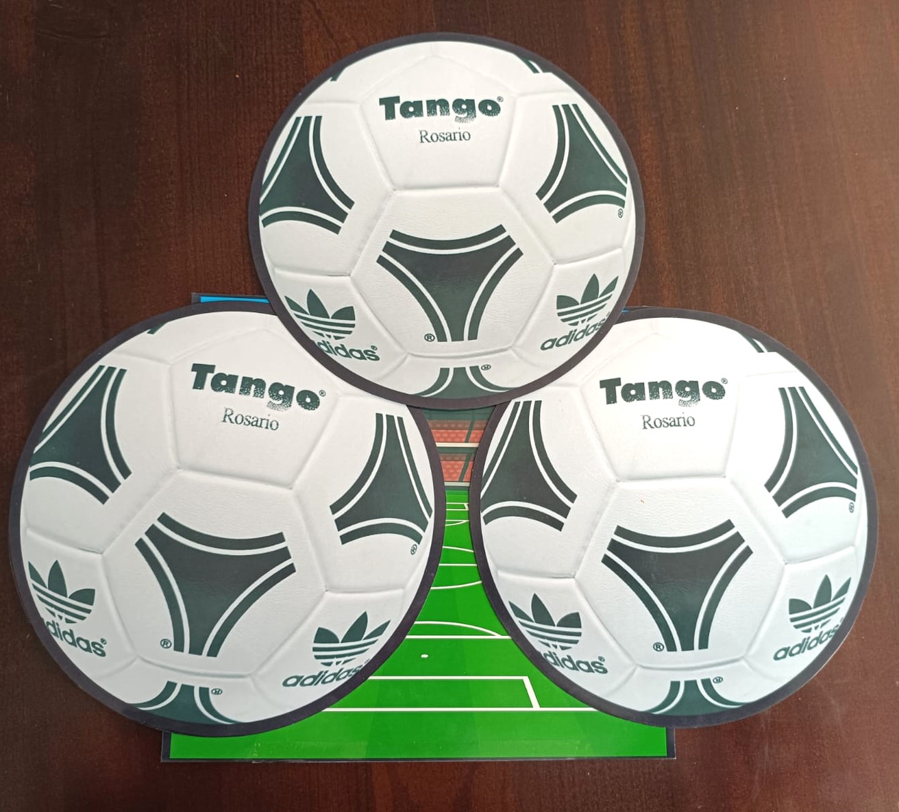 El mago presenta 3 pelotas clásicas blanco y negro, de esas que todos recuerdan de los viejos mundiales. A la vista del público, muestra un sobre especial que representa un estadio de fútbol.
